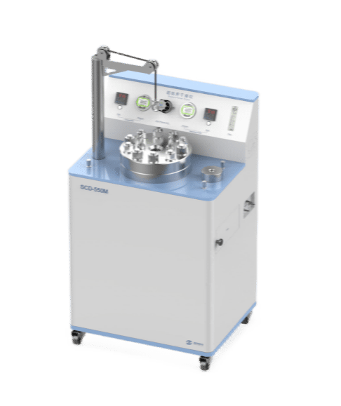 在封閉腔室中,放置陽極靶材,充入氣體,保持一定的真空度,在陽極和陰極之間加載高壓,會發生輝光放電現象。電離的氣體離子會轟擊、侵蝕陽極靶材。靶材原子會因此向四周擴散,在磁力的束縛下在一定范圍內沉積,最終在樣品表面形成一個均勻的鍍層。這個鍍層可以抑制荷電,減小熱損傷,提高二次電子產率,從而改善掃描電鏡觀察效果。平時使用時,最常見靶材的是金靶。正是這個原因,離子濺射儀也俗稱“噴金儀”。然而,為了獲得更細小的晶粒尺寸、更薄的連續鍍層,有時候也會使用其他靶材(比如鉻、鉑金、銅)。